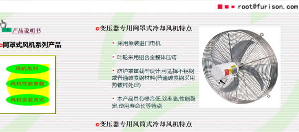 佛山市富利明電力電器配件有限公司是加拿大外商獨資企業。引進北美先進技術,專業生產網罩式變壓器冷卻風機,風機控制柜,電纜接線盒等系列變壓器配套產品。冷卻風機選用原裝電機,葉輪采用航空螺旋漿設計技術,低噪音,低能耗,散熱效果極佳;風機控制柜具有多種系列,綜合傳統的機電繼電開關技術和先進的電力電子開關技術,適用各種變壓器冷卻機組的動力控制,并滿足電力運行部門"三遙"要求;接線盒適用于冷卻風機與控制柜的電纜連接,易拔插、防塵、防水,便于安裝及日常維護。我司是ISO認證企業,具有良好的信譽,合理的價格,完善的售后服務及全面質保承諾,誠信地為廣大用戶服務。