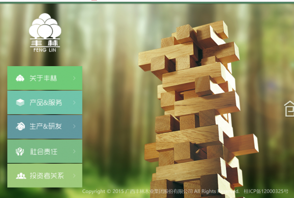 豐林木業(yè)集團股份有限公司(以下簡稱“公司”或“本公司”)是香港豐林國際有限公司董事長劉一川先生創(chuàng)始的一家中外合資股份有限公司,是廣西的一家國內(nèi)A股上市企業(yè),公司股票簡稱“豐林集團”,股票代碼601996。公司是“國家高新技術(shù)企業(yè)、國家林業(yè)重點龍頭企業(yè)和農(nóng)業(yè)產(chǎn)業(yè)化國家重點龍頭企業(yè)”,獲得35項國家專利,是國內(nèi)智能精造技術(shù)綠色環(huán)保企業(yè)。公司于2010年被中國經(jīng)濟觀察報評為“2010年度中國最佳低碳企業(yè)評選”20強,在當(dāng)時的中國人造板行業(yè)極為少見。近年來,公司屢獲“中國林業(yè)產(chǎn)業(yè)突出貢獻(xiàn)獎”、“中國最佳低碳企業(yè)”、“中國林業(yè)重點龍頭企業(yè)”、“中國板材行業(yè)最具影響力(品牌)制造企業(yè)”、“中國國際林業(yè)產(chǎn)業(yè)博覽會金獎”等多項殊榮,在行業(yè)和市場上樹立了良好的品牌形象。2017年,公司產(chǎn)品獲得中國林產(chǎn)工業(yè)協(xié)會的“精品人造板”與廣西質(zhì)量技術(shù)監(jiān)督局的“廣西名牌”榮譽稱號,集團總經(jīng)理王高峰先生被中國林產(chǎn)工業(yè)協(xié)會授予“中國林產(chǎn)工業(yè)終身成就獎”。