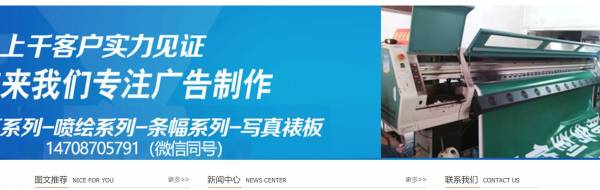 昭通UV軟*雕刻制作公司選用我司企業廣告設計行業的網站優化產品,其SEO關鍵詞有 廣告制作公司,噴繪公司,廣告制作,噴畫公司,廣告公司,UV平板打印,昭通廣告公司,昭通鑫美數噴,昭通噴繪制作,昭通UV軟膜雕刻制作公司,昭通一站式廣告制作供應商。其特點是用很合適的展示方式、展示效果、站點框架,把客戶及其用戶很關心的問題突出表現;并以簡潔明朗的設計風格,清晰展現公司水平實力,確保一秒抓住目標用戶眼球,給用戶留下良好的第一印象。昭通UV軟*雕刻制作公司成立于2002年,是經昭通市市場監督管理局審核的有資質的公司,其統一社會信用代碼:9153280056**6597XF。公司地址:云南省昭通市昭陽區通江路和興街。