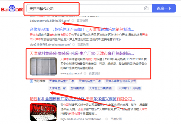 天津市雍*包裝制品有限公司選用我司企業箱包的網站優化產品,其SEO關鍵詞有箱包。一對一定制服務,產品經理在線支持,無憂售后,適用于各個企業,提供一站式網絡營銷服務。百度搜索引擎優化,提升品牌關鍵詞的正面內容信息展現,體現良好的口碑宣傳。天津市雍*包裝制品有限公司成立于1991年,是經天津市市場監督管理局審核的有資質的公司,其統一社會信用代碼:91120222**61075445。公司地址:天津市武清區黃莊街104國道西側50米處查看。