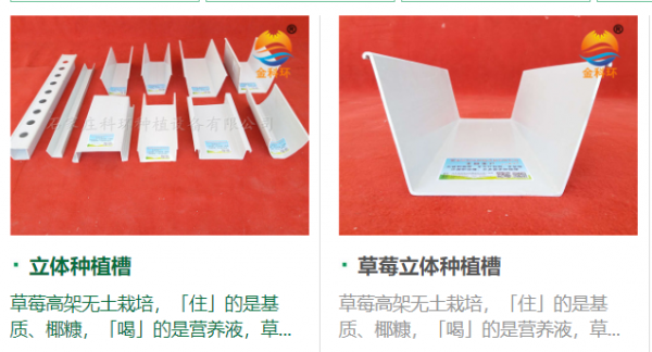 石家莊科環(huán)種植設(shè)備有限公司,成立于2001年,位于河北省石家莊市藁城區(qū)北孟工業(yè)區(qū)。主營(yíng)業(yè)務(wù)有:生產(chǎn)加工立體種植槽,草莓種植槽,水培種植槽,瓜果蔬菜種植槽及各種配件設(shè)施等。產(chǎn)品用于農(nóng)業(yè)觀光園、生態(tài)式種植、無(wú)土式種植、能為種植:草莓、蔬菜、花生、金針菇等提供優(yōu)質(zhì)的產(chǎn)品。種植立體草莓槽可用于多種形式的種植,立體高架式、懸掛種植式、平放于地面種植式。立體種植槽可用于無(wú)土立體栽培種植,槽內(nèi)可放置基質(zhì)肥或營(yíng)養(yǎng)液。公司秉承“保證產(chǎn)品質(zhì)量,保持公司信譽(yù)”的經(jīng)營(yíng)理念,堅(jiān)持“客戶至上”的原則為廣大客戶提供優(yōu)質(zhì)的服務(wù)。歡迎來(lái)電洽談業(yè)務(wù)!