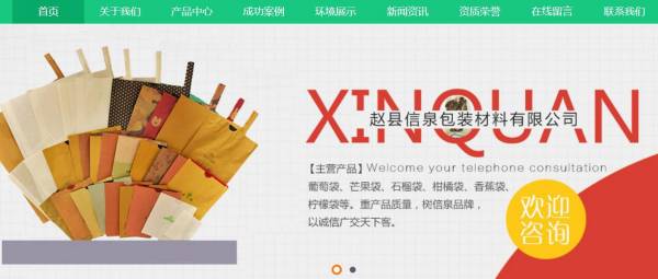 趙縣信*包裝材料有限公司選用我司企業紙布包裝行業的網站優化產品,其SEO關鍵詞有 趙縣信*包裝材料有限公司,葡萄袋,芒果袋,石榴袋,柑橘袋,香蕉袋,檸檬袋。其特點是用很合適的展示方式、展示效果、站點框架,把客戶及其用戶很關心的問題突出表現;并以簡潔明朗的設計風格,清晰展現公司水平實力,確保一秒抓住目標用戶眼球,給用戶留下良好的第一印象。趙縣信*包裝材料有限公司成立于2002年,是經趙縣市市場監督管理局審核的有資質的公司,其統一社會信用代碼:91130133**4301673。公司地址:河北省趙縣大安東鎮大安村。
