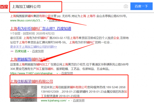 上海佳航服裝輔料有限公司選用我司企業加工輔料的網站優化產品,其SEO關鍵詞有加工輔料。按天計費,最快7天上詞,不到首頁不扣費。關鍵詞質量保證,白帽SEO符合百度算法,360、搜狗、移動端等排名效果免費贈送。上海佳航服裝輔料有限公司成立于2005年,是經上海市市場監督管理局審核的有資質的公司,其統一社會信用代碼:913101147724445093。公司地址:上海市嘉定區外岡鎮中涇村243號2幢。