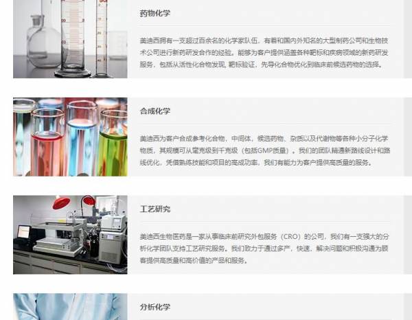 上海美迪西生物醫(yī)藥股份有限公司選用我司企業(yè)中西藥品行業(yè)的網(wǎng)站優(yōu)化產(chǎn)品,其SEO關(guān)鍵詞有 上海生物公司,臨床前研究,CRO公司,藥代動(dòng)力學(xué)服務(wù),藥物篩選服務(wù),藥物化學(xué)服務(wù),藥物安全評價(jià),毒理學(xué)研究,美迪西,化合物活性篩選,醫(yī)藥研發(fā)外包。其特點(diǎn)是用很合適的展示方式、展示效果、站點(diǎn)框架,把客戶及其用戶很關(guān)心的問題突出表現(xiàn);并以簡潔明朗的設(shè)計(jì)風(fēng)格,清晰展現(xiàn)公司水平實(shí)力,確保一秒抓住目標(biāo)用戶眼球,給用戶留下良好的第一印象。上海美迪西生物醫(yī)藥股份有限公司成立于2004年,是經(jīng)浦東新區(qū)市場監(jiān)督管理局審核的有資質(zhì)的公司,其統(tǒng)一社會(huì)信用代碼:9131000075842961XY 。公司地址:上海市浦東新區(qū)川大路585號。
