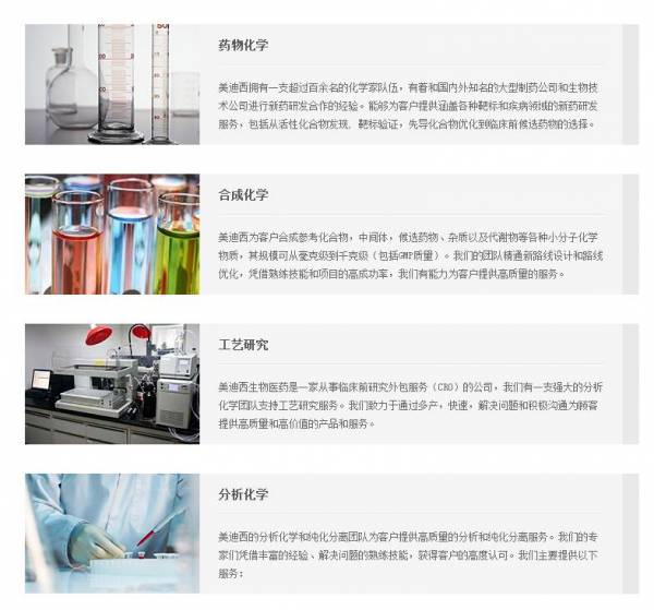 上海美迪西生物醫藥股份有限公司選用我司企業研發服務行業的網站優化產品,其SEO關鍵詞有 上海生物公司,臨床前研究,CRO公司,藥代動力學服務,藥物篩選服務,藥物化學服務,藥物安全評價,毒理學研究,美迪西,化合物活性篩選,醫藥研發外包。其特點是用很合適的展示方式、展示效果、站點框架,把客戶及其用戶很關心的問題突出表現;并以簡潔明朗的設計風格,清晰展現公司水平實力,確保一秒抓住目標用戶眼球,給用戶留下良好的第一印象。上海美迪西生物醫藥股份有限公司成立于2004年,是經浦東新區市場監督管理局審核的有資質的公司,其統一社會信用代碼:9131000075842961XY。公司地址:上海市浦東新區川大路585號。