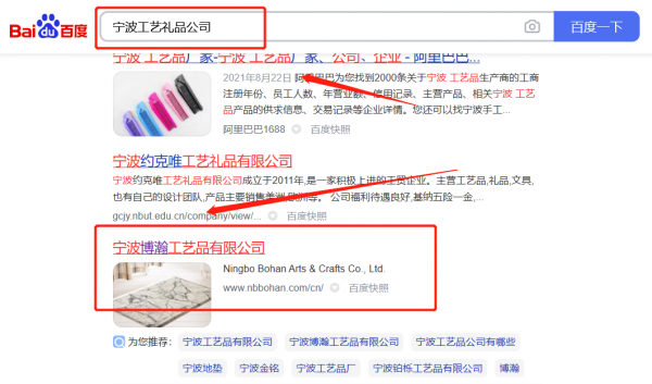 寧波博*工藝品有限公司選用我司企業工藝禮品行業的網站優化產品,其SEO關鍵詞有工藝禮品。利用全新的SEO技術,在短時間內使關鍵詞占領搜索引擎首頁,為企業官網獲取更多更精準的流量。大數據分析,針對性定位,推廣,專屬定制最適合您,效果最全面的的推廣方案,更有效果保證!寧波博*工藝品有限公司成立于2002年,是經寧波市市場監督管理局審核的有資質的公司,其統一社會信用代碼:91330201**232411XU。公司地址:浙江省寧波杭州灣新區圃源路19號。