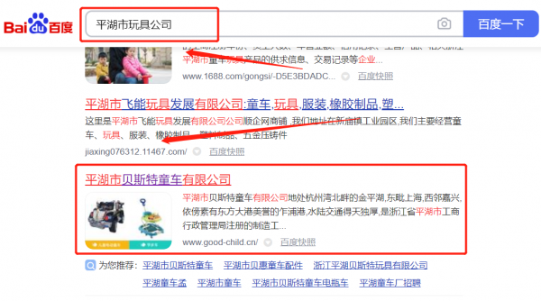 平湖市貝*特童車有限公司關(guān)鍵詞搜索排名最快上詞效果展示