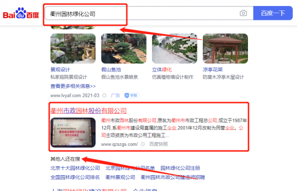 衢州市*園林股份有限公司選用我司企業(yè)園林綠化的網站優(yōu)化產品,其SEO關鍵詞有園林綠化。3-15天快速提升網站前五頁關鍵詞排名上百度首頁,幫助客戶增加流量,提高成交量,為您帶來更多潛在客戶,打造客戶品牌影響力。衢州市*園林股份有限公司成立于1987年,是經衢州市市場監(jiān)督管理局審核的有資質的公司,其統(tǒng)一社會信用代碼:91330800**9808544L。公司地址:浙江省衢州市區(qū)西安路156號。