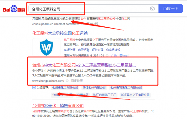 臺州市*大化工有限公司百度關鍵詞排名排名案例欣賞