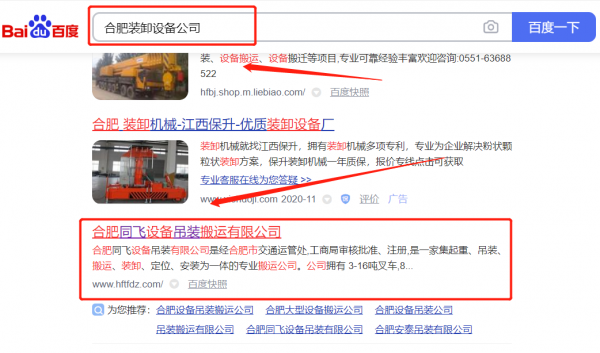 合肥同*設備吊裝有限公司網絡推廣最快上詞效果展示