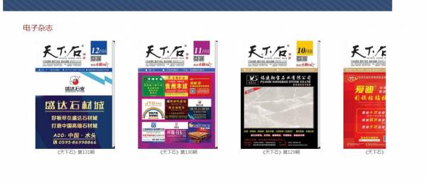 《天下石》雜志為南安*然文化傳播旗下平臺。創(chuàng)刊于2005年10月,為月刊,閩固印廣登號(2015)第01號,國際標準刊號:ISSN2224-3984。因為良好的服務、前瞻的設計理念、豐富的文化內(nèi)涵,尤其是良好的廣告效益而獲得社會各界的廣泛贊譽,多年來《天下石》已在國內(nèi)石材行業(yè)形成自己的影響力,并擁有眾多忠實讀者和客戶群體。本刊還得到包括中國石材工業(yè)協(xié)會、上海石材行業(yè)協(xié)會、山東省石材行業(yè)協(xié)會、福建省石材行業(yè)協(xié)會、廣東省石材行業(yè)協(xié)會等專家學者、領(lǐng)導們的一致好評。