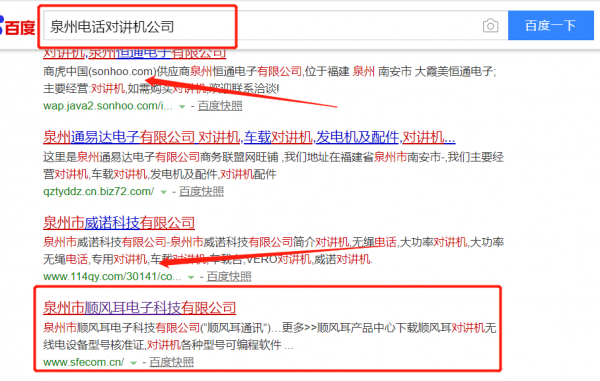 我們公司與泉州市順風耳電子科技有限公司合作中,對這個公司所經營的電話對講機這個行業提供了關鍵詞搜索排名,與該公司的合作,更多的客戶讓我們公司為其提供關鍵詞搜索排名,通過每一次合作,我們公司不斷完善自己,同時希望合作伙伴在經營的路上越來越好。
