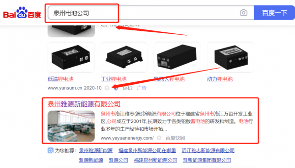 我們公司與泉州市*江雅志(源)新能源有限公司合作中,對這個公司所經營的電池這個行業提供了網站排名,與該公司的合作,更多的客戶讓我們公司為其提供關鍵詞搜索排名,通過每一次合作,我們公司不斷完善自己,同時希望合作伙伴在經營的路上越來越好。