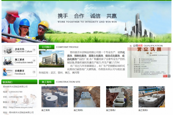 鄂州*洋水泥制品有限公司選用我司企業建筑建材行業的網站優化產品,其SEO關鍵詞有 武漢化糞池,武漢預制化糞池,鋼筋混凝土化糞池,鋼筋組合式化糞池,武漢成品化糞池,鄂州化糞池,鄂州預制化糞池,黃石化糞池,黃石預制化糞池,黃岡化糞池,黃岡預制化糞池。其特點是用很合適的展示方式、展示效果、站點框架,把客戶及其用戶很關心的問題突出表現;并以簡潔明朗的設計風格,清晰展現公司水平實力,確保一秒抓住目標用戶眼球,給用戶留下良好的第一印象。鄂州*洋水泥制品有限公司成立于2013年,是經鄂州市市場監督管理局審核的有資質的公司,其統一社會信用代碼:9142070006352**384。公司地址:鄂州市蒲團鄉橫山村